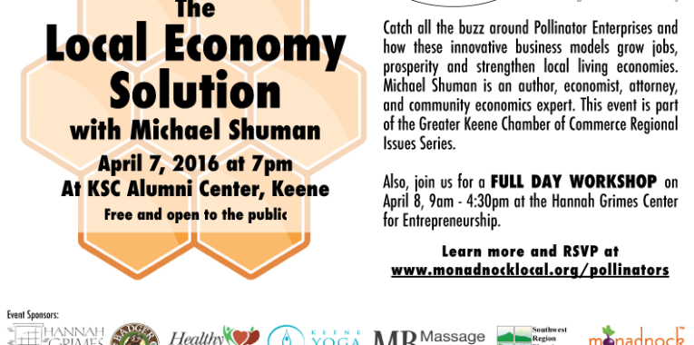 We invite you to learn more about Pollinator Enterprises at Michael Shuman’s free public talk on April 7th at 7 p.m. at the Keene State College Alumni Center. This event is part of the Greater Keene Chamber of Commerce’s Regional Issues Series and is sponsored by the Hannah Grimes Center for Entrepreneurship, Healthy Monadnock, Keene Yoga Center and W.S. Badger Company.  Michael will also lead a more in-depth daylong workshop on April 8th at the Hannah Grimes Center for Entrepreneurship.  Learn more at monadnocklocal.org/pollinators