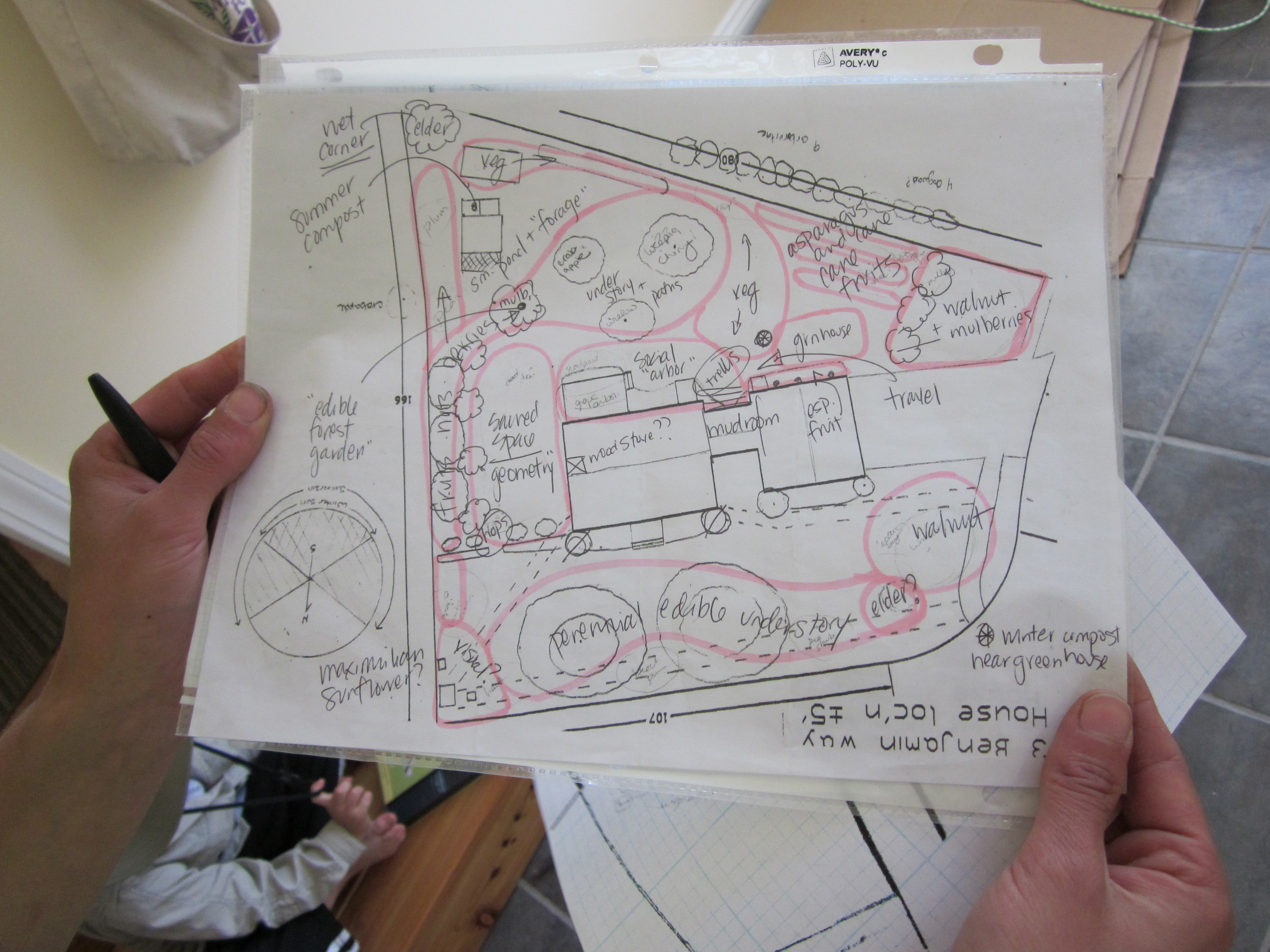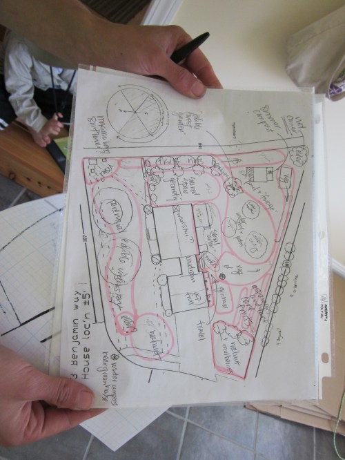 In contrast with Amy’s wooded site, Mary’s year and a half year old site is in a housing development. It is a perfect place for Mary to spread her permaculture ethics to her neighbors and show how you can bring both beauty and function together. For example, instead of burning bush, she advocates blueberries for striking fall foliage – and delicious berries too.